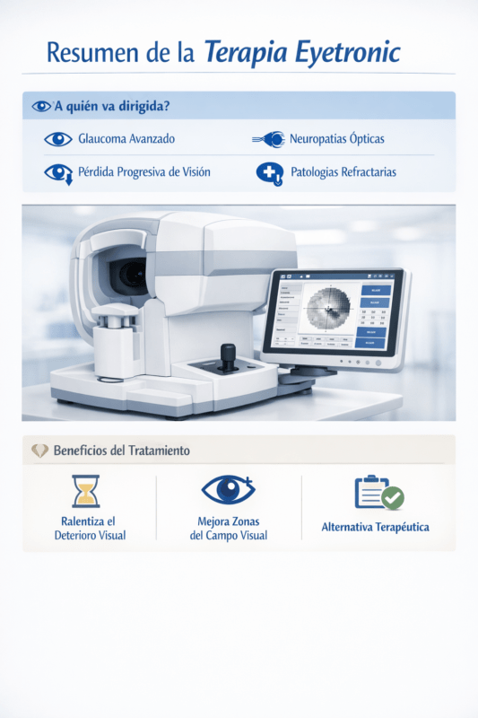 En el primer caso es un sistema de fotobiomodulación que estimula la producción de energía en las células de la retina mejorando su función y ralentizando su degeneración, mientras que en el segundo se trata de una estimulación eléctrica controlada sobre el nervio óptico para activar el metabolismo neuronal, restaurar su funcionalidad y proteger las células visuales de mayores daños.